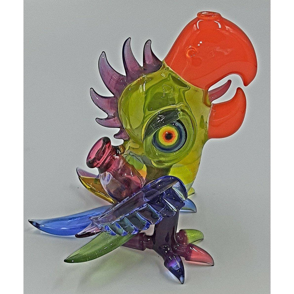 Created by RJ Glass, the Parrot bubbler water pipe features a 45 degree, 10mm stem opening. Hand blown in the USA, this heady glass piece is amazing. The closer you look, the more artwork you will see. The side feathers fade from lavender to blue, the tail feathers are green, citron, lavender, gold/yellow and blue. The beak us an awesome solid color orange. The eyes have blue, green, yellow, orange, black, and red in a circular pattern on them. Another amazing heady glass piece by RJ Glass.